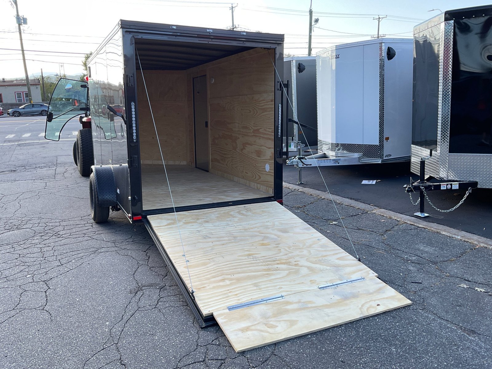 This enclosed trailer is designed for secure equipment transport, contractor tools, motorcycles, and mobile business applications. The reinforced steel frame and enclosed body protect your cargo from weather and road debris.